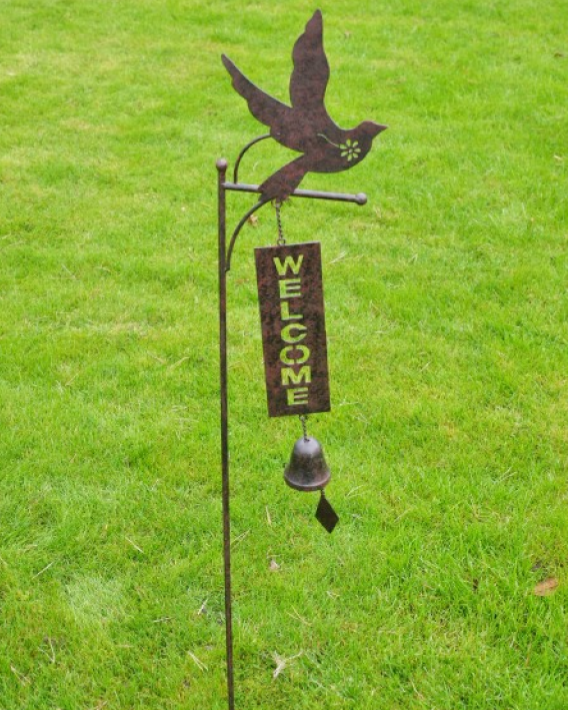 Lovley 'Welcome' metal garden stake, with beautifully designed bird cut-out on the top. Bell located just bellow the welcome sign.