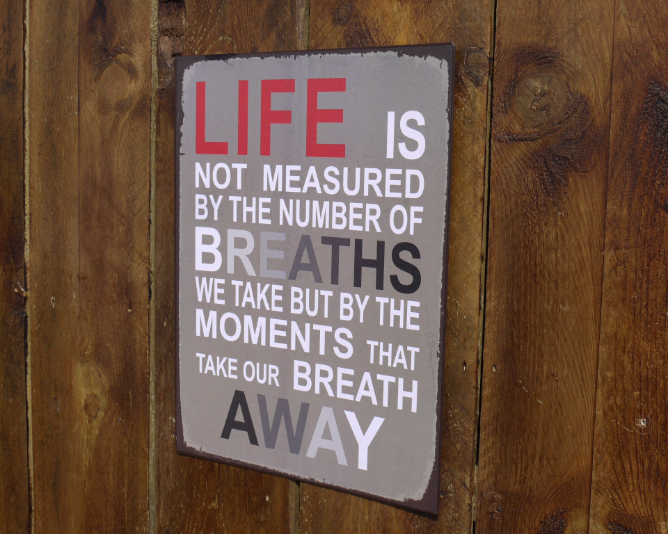 The sign reads : 'LIFE IS NOT MEASURED BY THE NUMBER OF BREATHS WE TAKE BUT BY THE MOMENTS THE TAKE OUT BREATH AWAY'