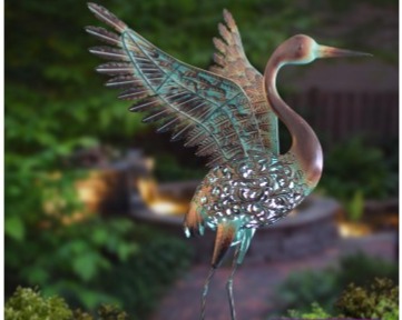 This statement winged crane, measuring 51cm x 66cm x 81cm comes into its own at twilight when the solar light shines through the cut out patterned bodywork. Constructed from metal with a verdigis finish it adds a touch of sophistication to any garden, especially near a pond.